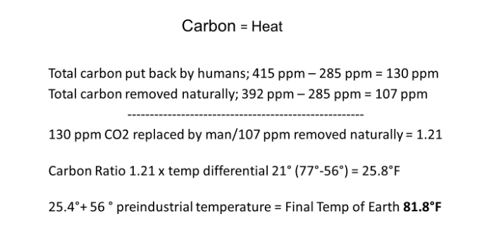 The ratio of carbon put back in the atmosphere by human activity, divided by the amount of carbon naturally removed by photosynthesis and converted to fossil fuels, is the Carbon Ratio. This ratio, times the temperature differential, determines what the Earth’s temperature will eventually be.
